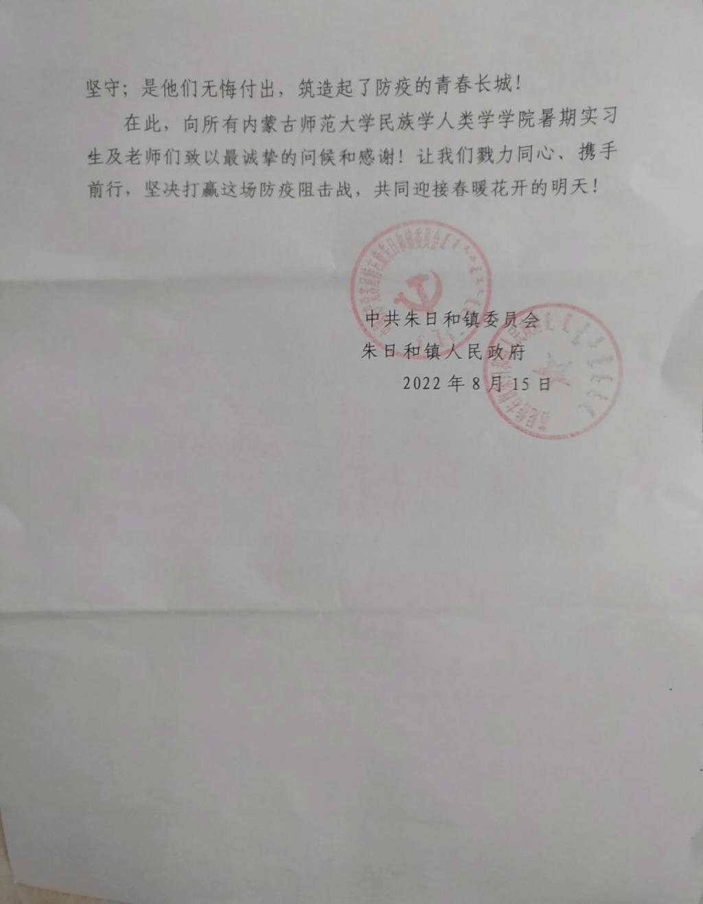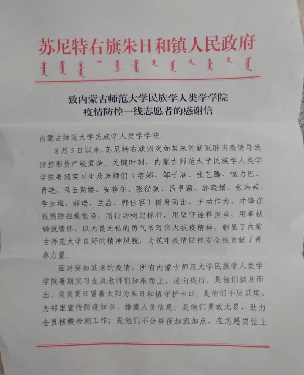 近日,苏尼特右旗朱日和镇人民政府向我院发来感谢信,对yl7703永利集团田野调查师生在新冠肺炎疫情防控中的突出贡献表示感谢,赞扬我院师生在疫情防控中表现出的挺身而出、主动作为、无私无畏、勇于担当的精神风貌。