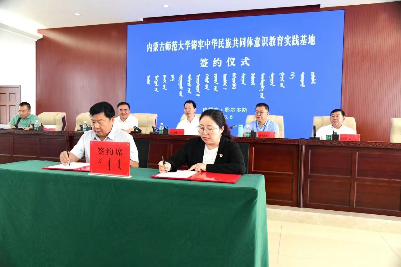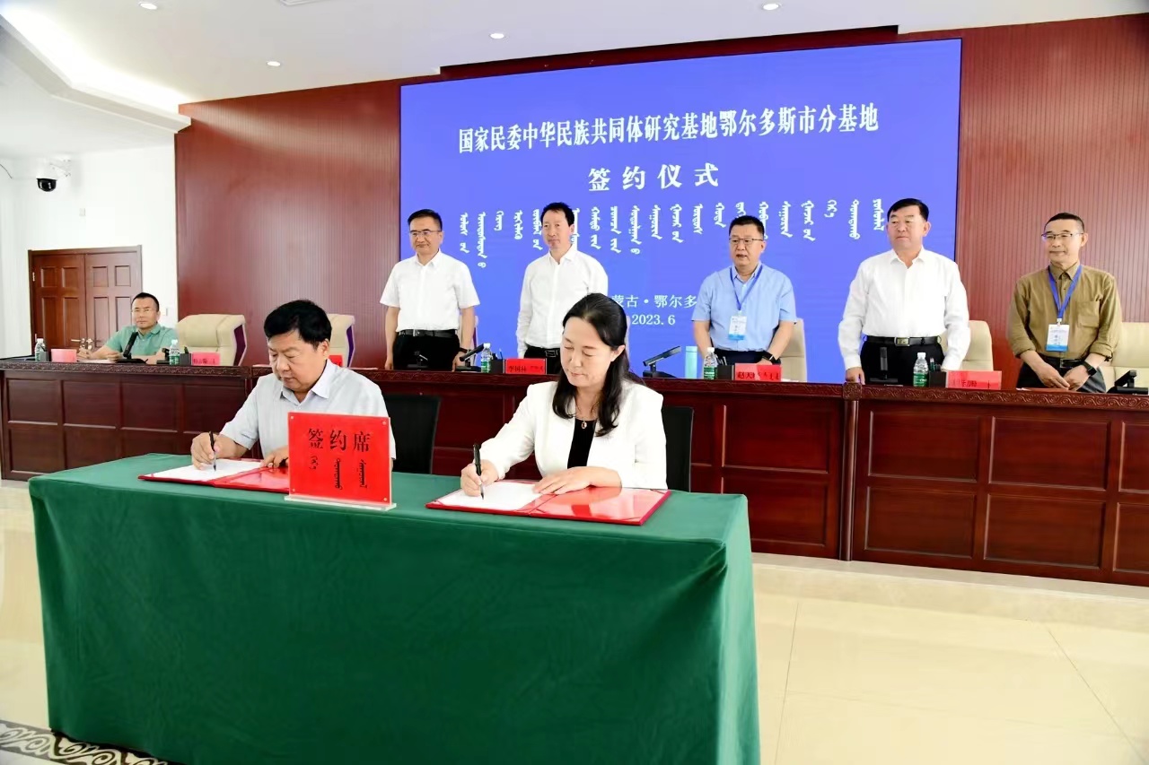 会议举行了国家民委中华民族共同体研究基地鄂尔多斯市分基地、yl7703永利集团铸牢中华民族共同体意识教育实践基地揭牌仪式。额登毕力格与李树林共同为国家民委中华民族共同体研究基地鄂尔多斯市分基地、yl7703永利集团铸牢中华民族共同体意识教育实践基地揭牌。特古斯与我校yl7703永利集团党委书记包凤兰、科技处(社科处)处长咏梅分别代表双方签署了《建立国家民委中华民族共同体研究基地鄂尔多斯市分基地的合作协议》和《yl7703永利集团与鄂尔多斯市民委共建“铸牢中华民族共同体意识教育实践基地”合作协议》。