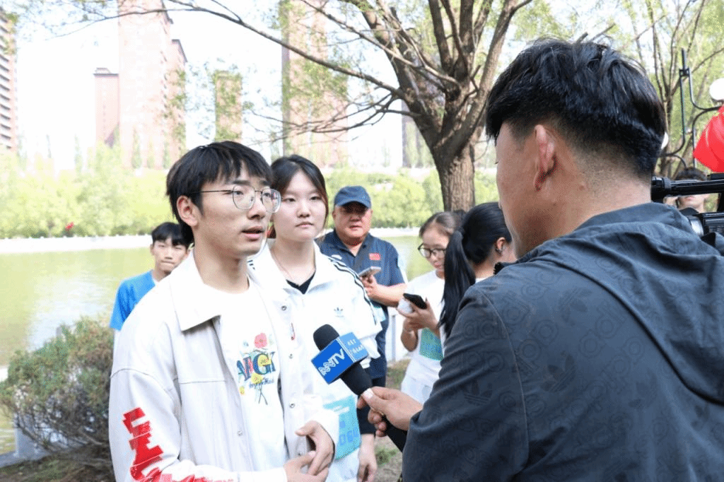 阳光照耀下的乌兰湖波光粼粼,我院师生在湖边集结热身,绕湖而行。我院代表队整齐前进,他们一边舒展筋骨,一边欣赏湖畔的美丽风光。秩序井然的队伍引起内蒙古日报记者的关注并对我院学生进行采访。参赛选手王周璇和学生干部黄长江在接受内蒙古日报采访时,脸上洋溢着自信与喜悦。
