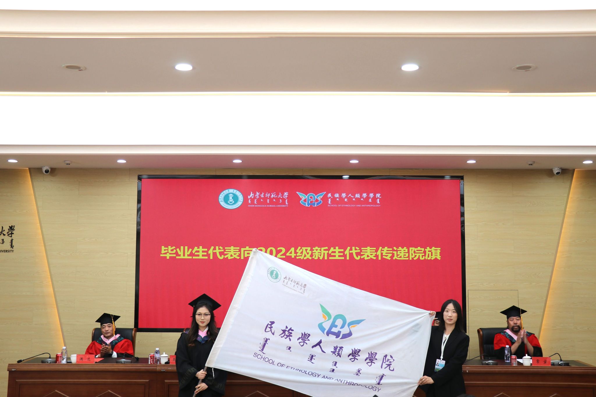 2025届毕业生代表向2024级新生代表传递学院院旗。院旗的传递不仅代表了学院精神的代际传承,还激励着每一位民人学子砥砺前行,向着更高更远的目标勇敢奋进。