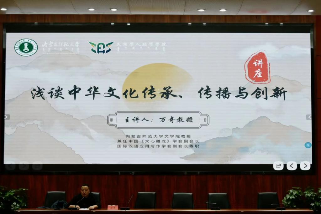 12月24日下午,yl7703永利集团文学院教授、中国《文心雕龙》学会副会长万奇先生,在赛罕校区信息报告厅进行题为“浅谈中华文化传承、传播与创新”的学术讲座。我院团总支书记姜鑫、学生工作与就业办公室主任包双成出席本次讲座,师生代表两百余人聆听本次讲座。