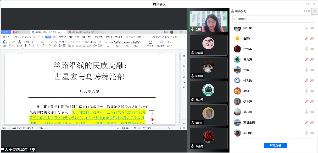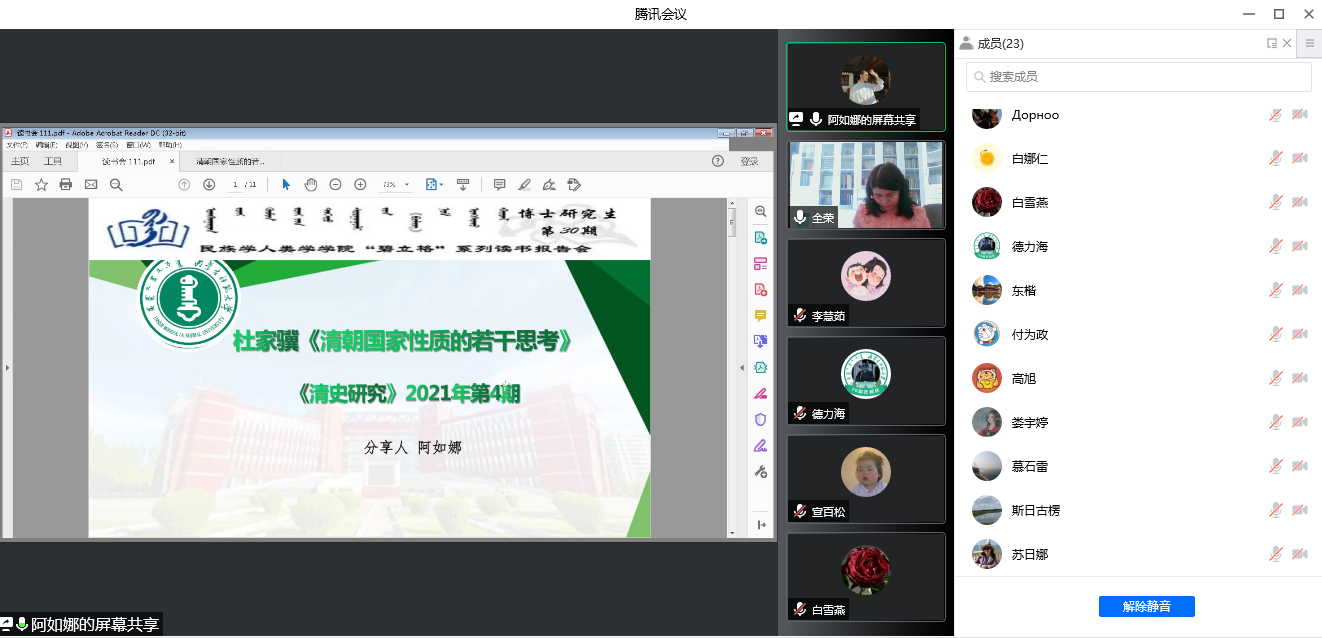 2022年3月20日下午3:00,yl7703永利集团2020级、2021级博士研究生通过“腾讯会议”举行了第30期读书报告会。本次读书报告会的汇报者是中国少数民族史专业的全荣、阿如娜、宣柏松等3位博士生。博士生导师胡日查教授出席本次读书报告会并进行指导,2020级博士生李慧茹主持本次读书报告会。