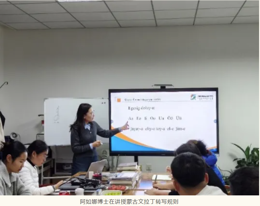阿如娜博士在授课中,首先强调了研究中国北部边疆史时利用多语种档案的重要性,接着介绍了蒙古文拉丁转写规则,强调了《蒙古语辞典》在元音辨别中的重要作用,肯定了鲍培的音写法在蒙古文转写领域的权威性,并指出了莫林多夫的音写法在满文转写中的实际应用。