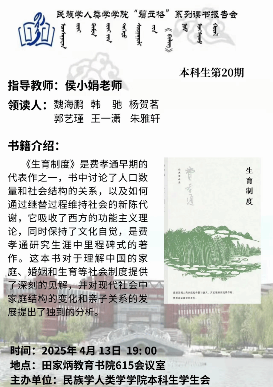 为丰富专业认知、拓宽专业视野,我院秉持笃学致知以夯基础、开卷启思以拓思路、读书明智以塑品格的理念,致力于营造积极向上、勤勉求知的学风。4月13日下午,本科生第20期“碧立格”系列读书报告会在田家炳教育书院615会议室成功举行。本期读书会由侯小娟老师指导,6位同学领读,阅读书目是《生育制度》。