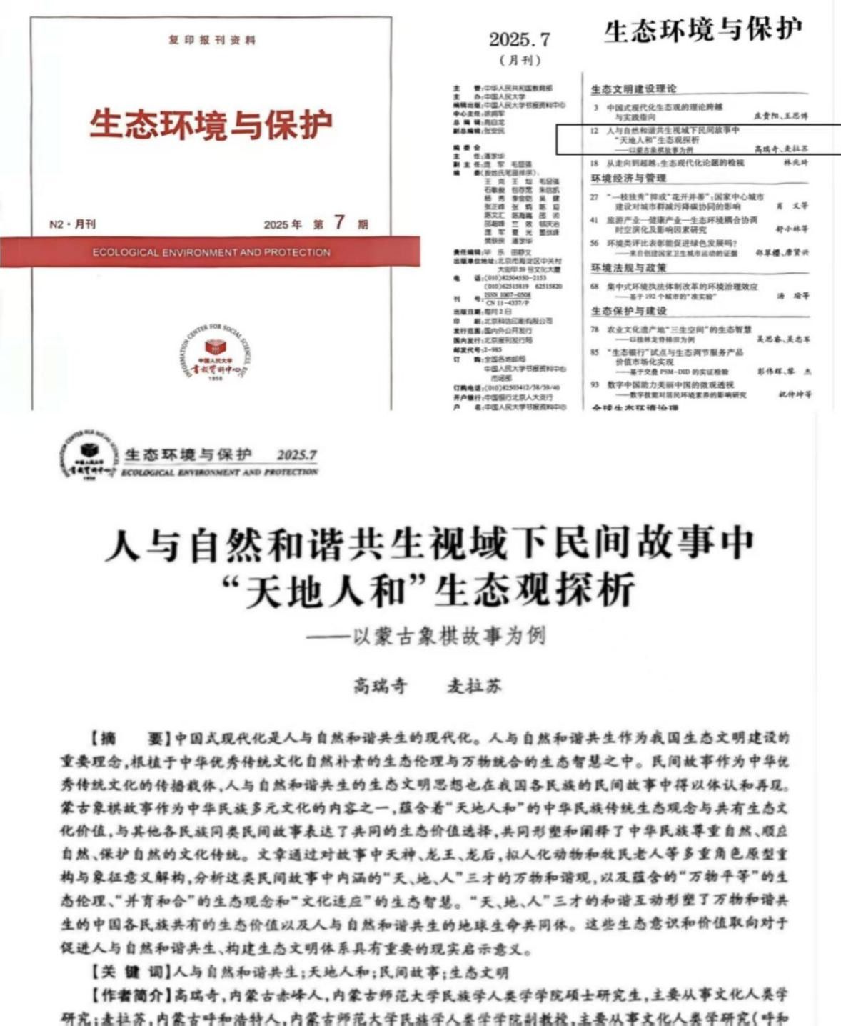我院硕士研究生高瑞奇同学撰写的论文《人与自然和谐共生视域下民间故事中“天地人和”生态观探析——以蒙古象棋故事为例》,被中国人民大学复印报刊资料《生态环境与保护》2025年第7期全文转载。