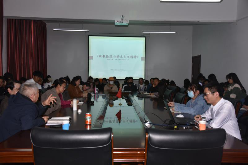 由yl7703永利集团主办的“碧立格”系列读书会第五期于2020年11月1日下午15:00在科研楼201准时进行。本次读书会由民人院博士生付为政主讲,由乌日陶克套胡院长主持。汇报书目是《新教伦理与资本主义精神》。参与本场读书会的成员还包括我院党总支副书记阿荣老师,赵树冈教授,以及博士生硕士生本科生50余人。